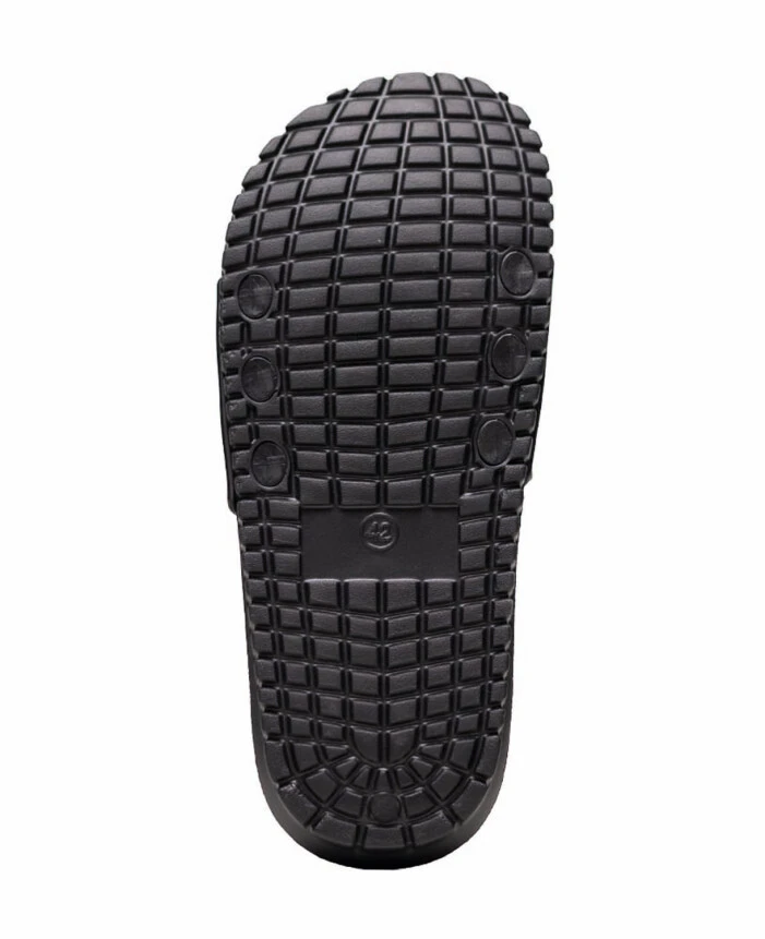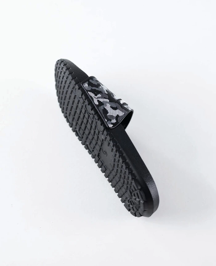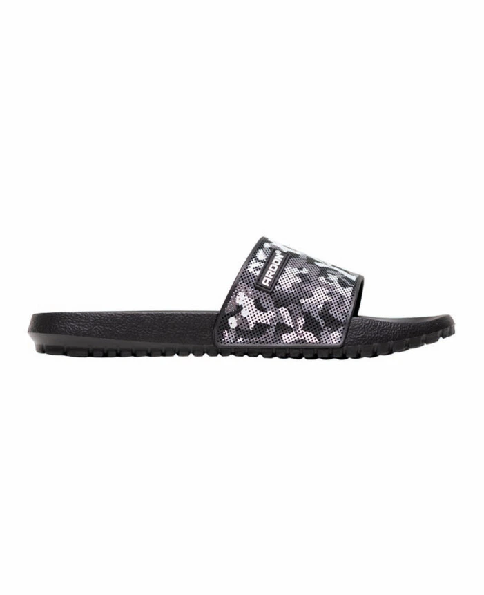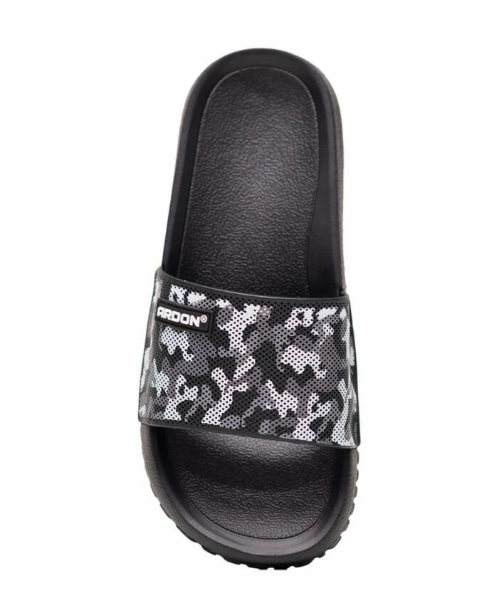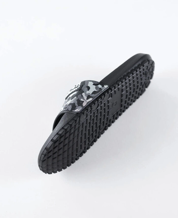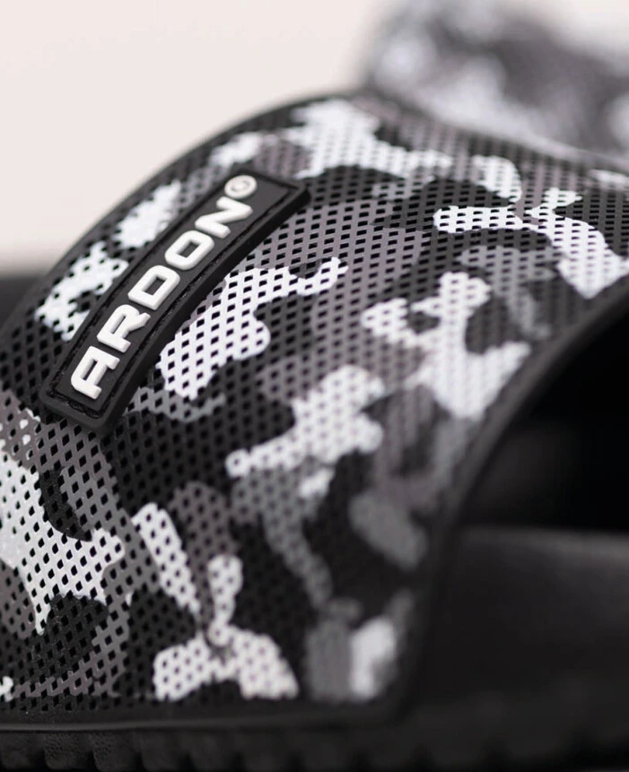 Lekkie i wygodne klapki z czarno‑szarym paskiem w deseń moro łączą nowoczesny wygląd z praktycznym zastosowaniem. Trwała cholewka z PVC dobrze trzyma kształt, a elastyczna podeszwa z EVA zapewnia miękki i stabilny krok. Dzięki uniwersalnemu designowi sprawdzają się w łazience, przy basenie oraz w domu, a biały tekst na pasku nadaje im sportowy i wyrazisty charakter.